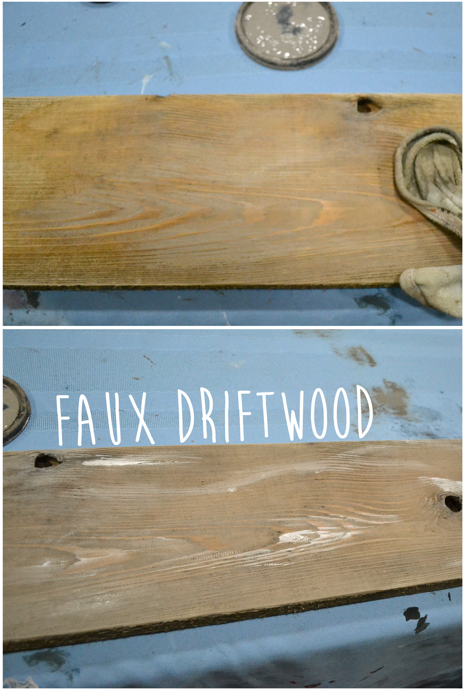 Using a paint wash, dark wax, and physical techniques (i.e. banging with car keys, etc), you can create a faux barn board or drift wood finish quite easily in very little time. For a barn board look you will want to go with a truer neutral grey wash, and for driftwood you will want to use a greige and an off-white paint to produce highlights. Have on hand a small cup of water, a clean cloth and your paints of choice. Dip the cloth into the water, dab it into the paint and rub it into the wood. Add more water to thin the paint if necessary so that the wood grain is visible beneath. Use the off-white in the same way to create dimension and highlights.