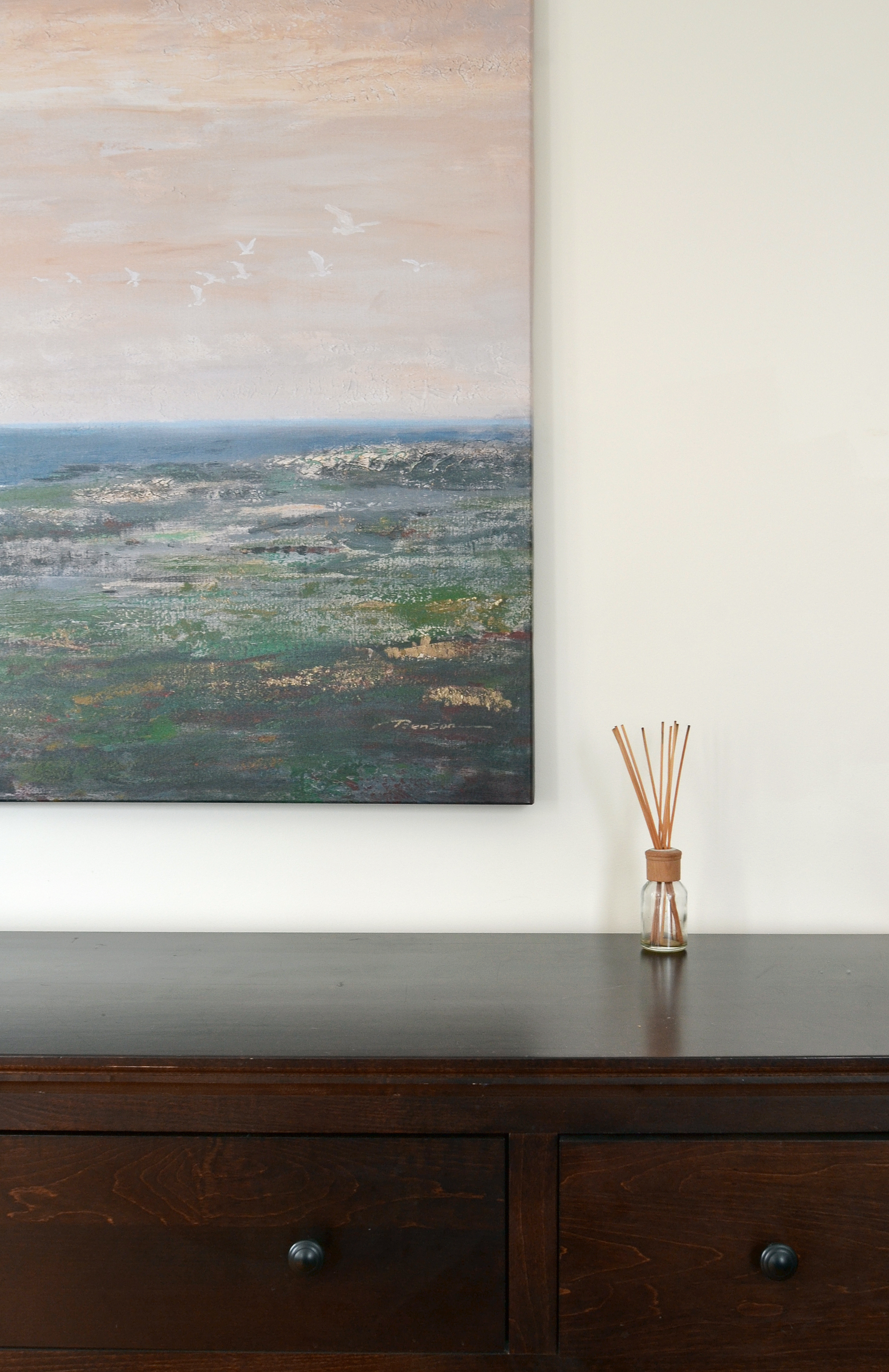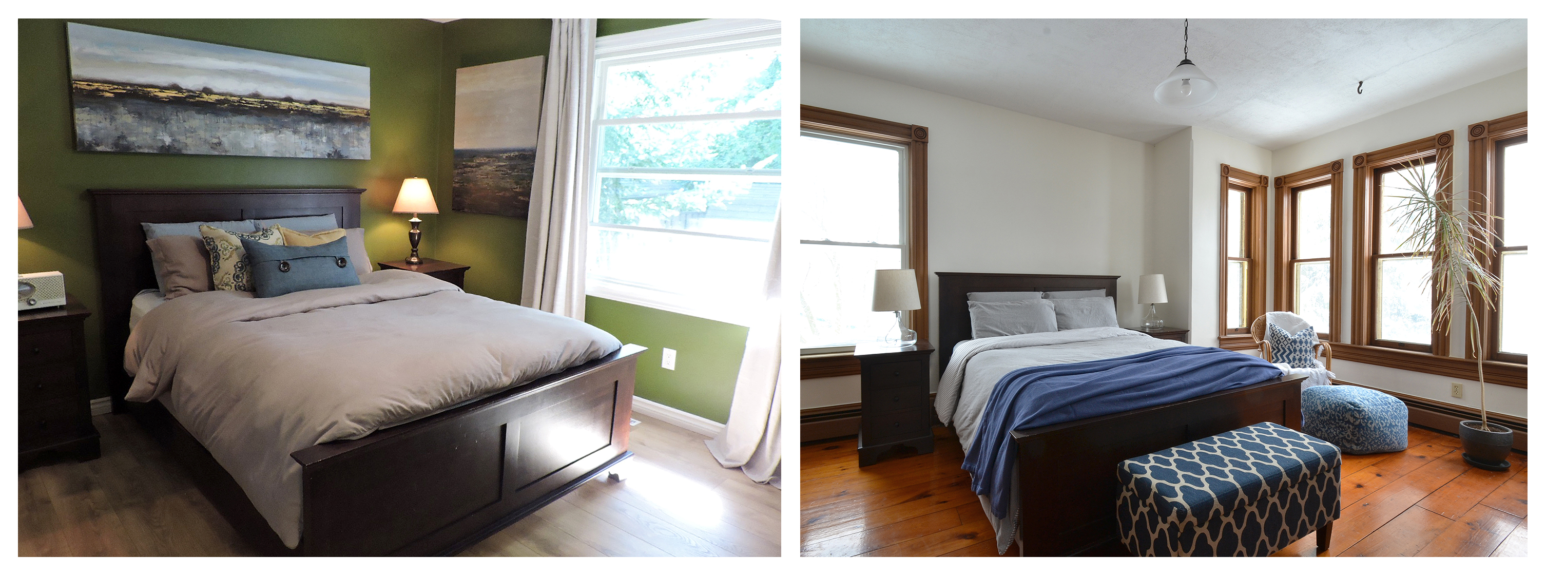 Different flooring and window trim not withstanding, I really do put this style transformation down to paint colour and accessories. How did I go from one to the other by only purchasing lamps? I know it can sound a little impossible at first glance, but the only trick here is that I shopped my house of course! I’ve talked about shopping your house before and I bring it up again because it is so useful and frugal to do. I love blues and thought they would pair well with the neutral walls and dark furniture of our bedroom set, but the reason I went with blue was I had a plethora of blue already at my disposal. Our previous home featured a beautiful navy accent wall in our open concept kitchen, and I had lots of blue decor to go with it that no longer made sense in our new living room because I no longer have a navy blue accent wall. Sad Face. Waste not, want not.