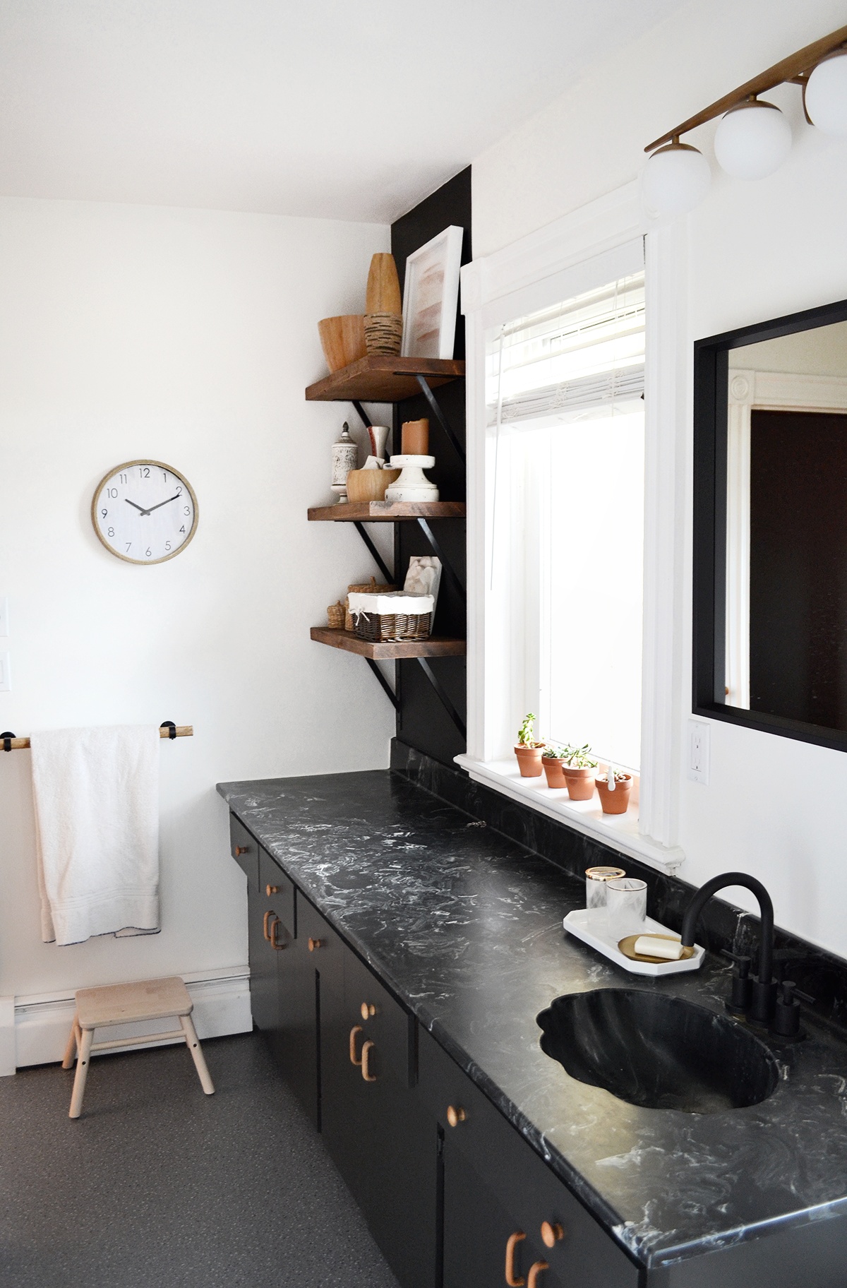 I looked around the space and asked myself how could I salvage this situation with its blah grey vinyl floors and black cultured marble sink and countertop.